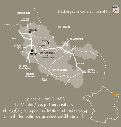 autoroute A4, sortie Metz-Est, direction Courcelles-Chaussy, Boulay. Au rond-point, direction Boulay. À Les Étangs, 1ère à droite, à Landonvillers 1ère à gauche.